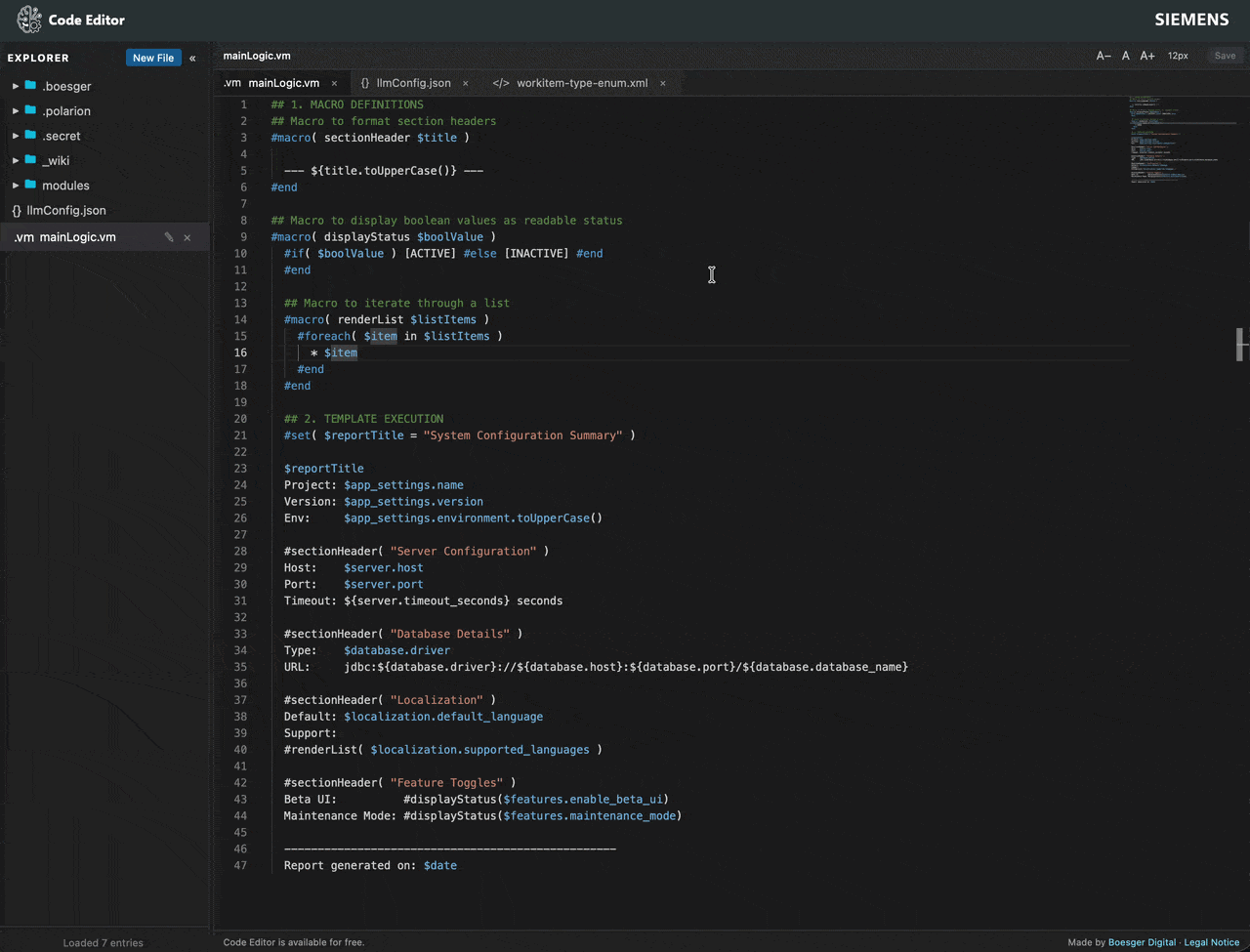 Upgrade your Polarion admin experience with a professional VS Code-style editor. Edit repository files in just three clicks with full syntax highlighting, auto-formatting, and project-aware scoping. Free to use and built for efficiency.